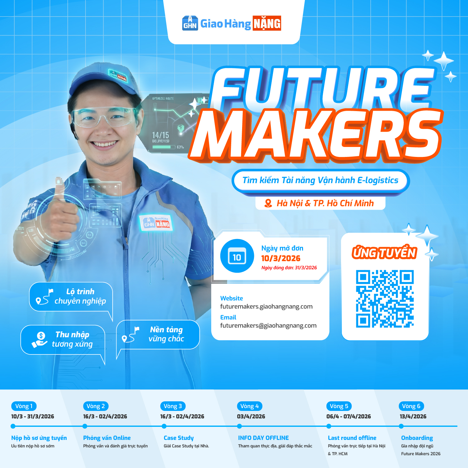 Future Makers (FM 2026) là chương trình tìm kiếm tài năng Vận hành E-Logistics của Giao hàng Nặng (đơn vị trực thuộc Giao Hàng Nhanh). Đích đến là vị trí Operations Team Leader (Trưởng nhóm Vận hành) tại Hà Nội và TP. HCM sau 12 tháng.